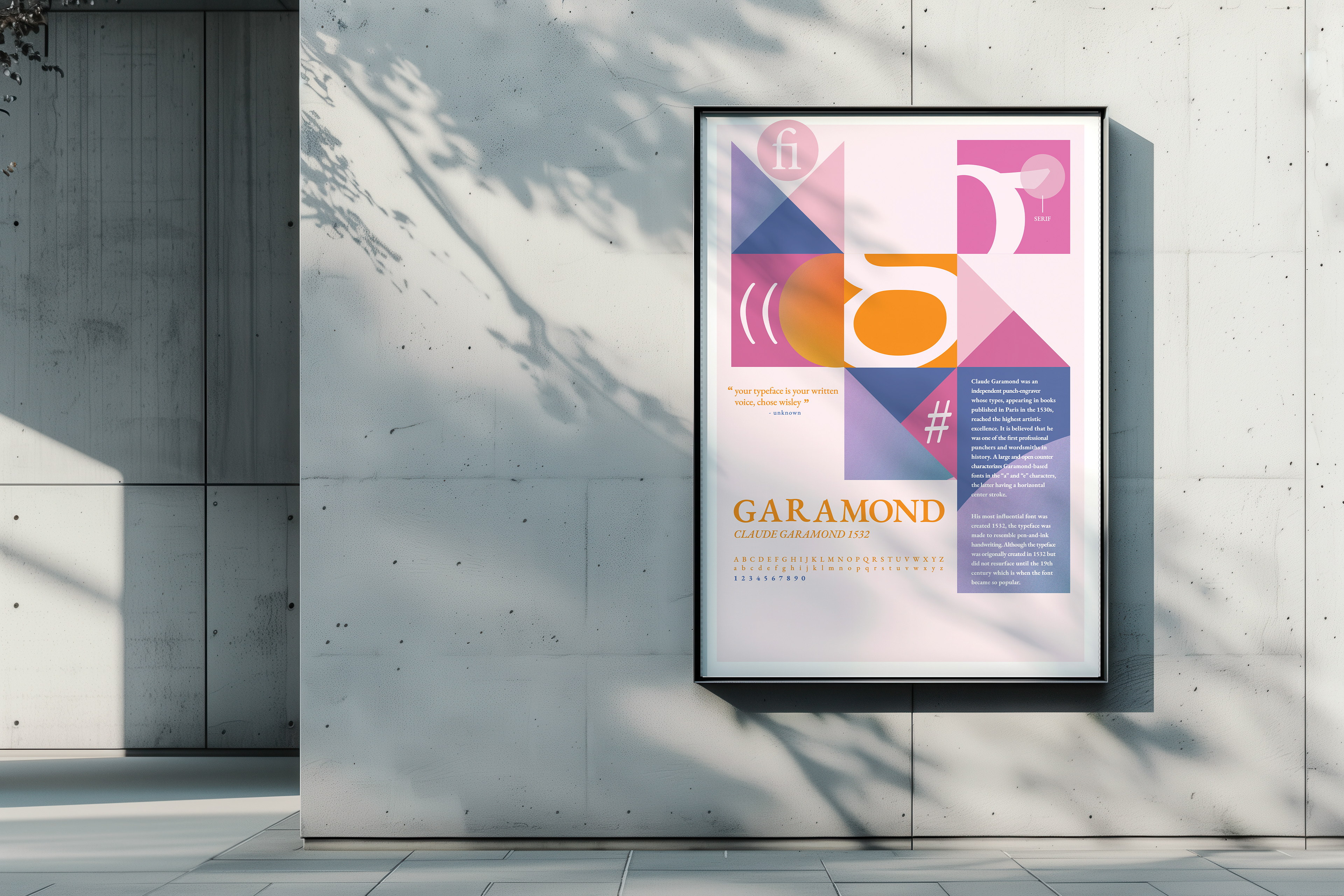 The final product illustrates a design that is both legible and visually interesting by presenting Garamond in a way that acknowledges its historic roots while presenting it in a more contemporary format. The bright colors, bold shapes, and dynamic layout show off the versatility of the typeface while keeping the work relevant to today's audiences.